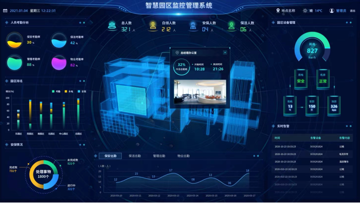 基于智能分析云平臺(tái)搭建的監(jiān)控管理系統(tǒng)。區(qū)別于傳統(tǒng)數(shù)據(jù)報(bào)表,將人員管理、設(shè)備管理及監(jiān)控信息一體化呈現(xiàn)。處理數(shù)據(jù)大,覆蓋區(qū)域廣,針對(duì)危險(xiǎn)實(shí)時(shí)告警。該系統(tǒng)一般要具有以下功能:首先,參數(shù)監(jiān)控,即將各現(xiàn)場(chǎng)數(shù)據(jù)通過(guò)中央控制臺(tái)直接顯示的同時(shí),如果顯示的具體數(shù)據(jù)超出設(shè)定的閾值,則系統(tǒng)要按照設(shè)定參數(shù)對(duì)相應(yīng)的設(shè)備狀態(tài)向相關(guān)人員報(bào)警,并引導(dǎo)其對(duì)相關(guān)參數(shù)正確的調(diào)整。其次,報(bào)警處理,即系統(tǒng)可以快速的將現(xiàn)場(chǎng)產(chǎn)生的報(bào)警信息及相關(guān)信息顯示在控制臺(tái)上,為風(fēng)險(xiǎn)處理提供依據(jù)。再次,事件控制,即系統(tǒng)可以直接對(duì)樓宇現(xiàn)場(chǎng)設(shè)備發(fā)出控制命令,降低人為操作失誤造成的損失。另外,運(yùn)行時(shí)間累計(jì)功能,即對(duì)分布在樓宇現(xiàn)場(chǎng)的設(shè)備運(yùn)行時(shí)間進(jìn)行統(tǒng)計(jì),為優(yōu)化系統(tǒng)結(jié)構(gòu)提供有效依據(jù)。除此之外,功耗計(jì)量功能,即對(duì)樓宇的能耗進(jìn)行測(cè)量、存儲(chǔ)和使用的功能,為綠色樓宇建設(shè)提供參考。更有人員考勤分析,拋去傳統(tǒng)考勤表。人員管理高效簡(jiǎn)潔。